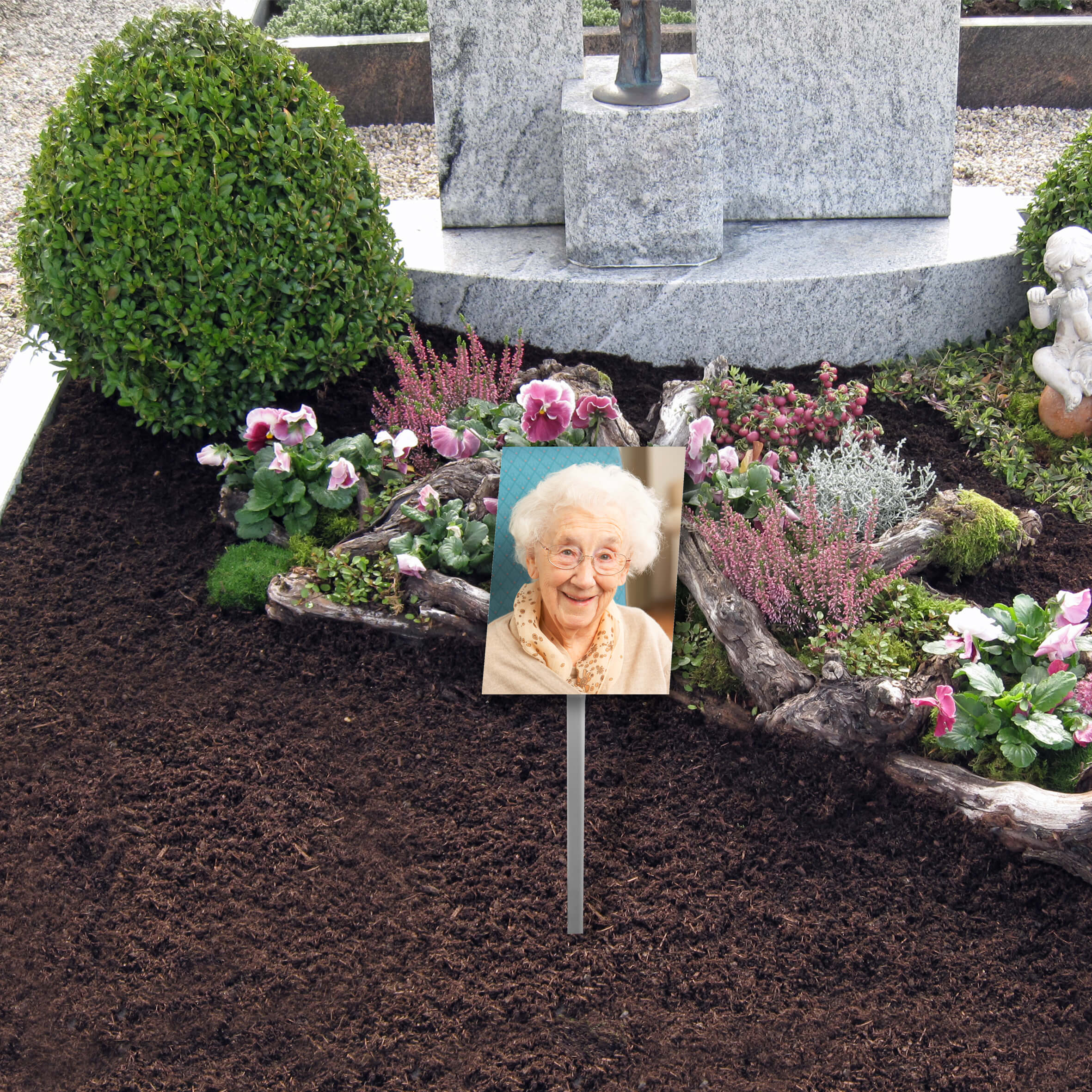 Mit unserem Grabschild lassen sich Gräber würdevoll verzieren. Der langanhaltende und qualitative Druck lässt das Foto für lange Zeit erstrahlen.