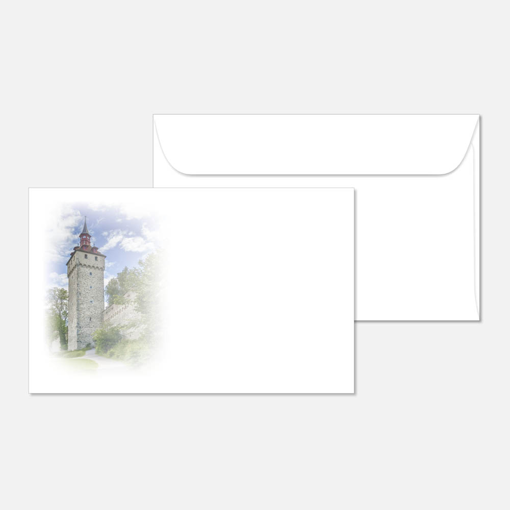 Weisses Kuvert mit dem Motiv «Luzern Museggmauer» im Format 190 x 120 mm mit selbstklebender Lasche.